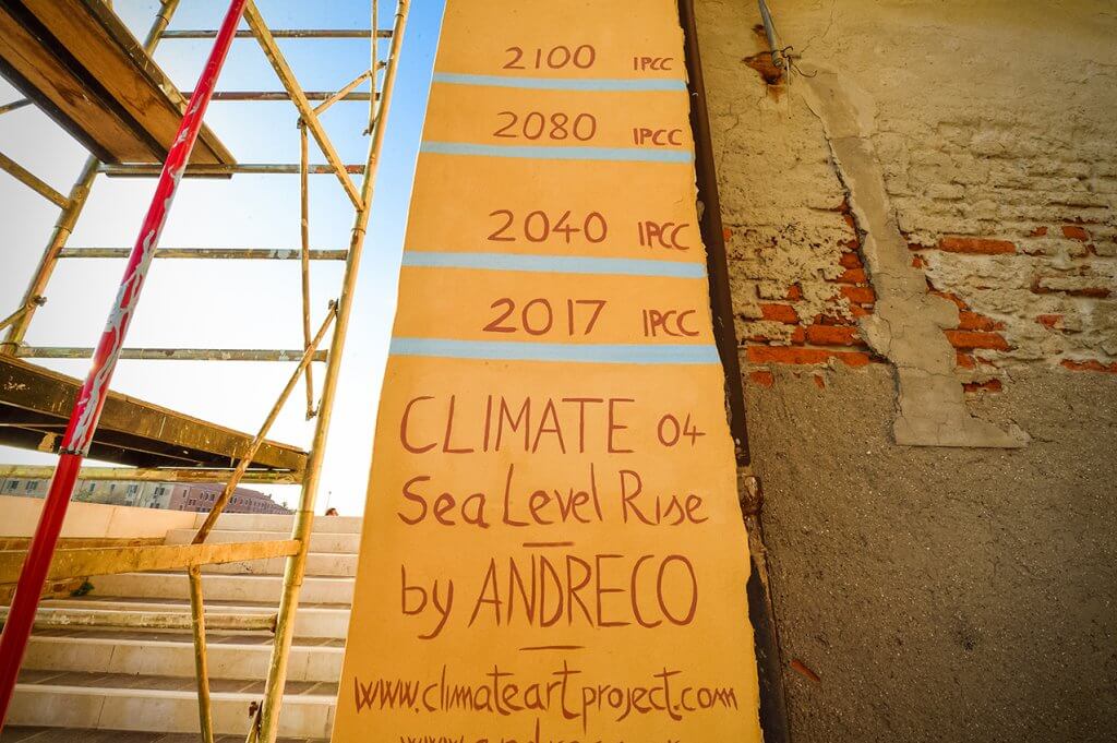 The Venice Art Biennale is hosting the final part of Andreco’s climate work highlighting sea level rise. A 100 meter long wall painting in Venice – a city chosen as most exposed to this kind of risk, visualises local studies on the topic. The installation includes some native plants to highlight how they can benefit Venice in adapting to the issue.