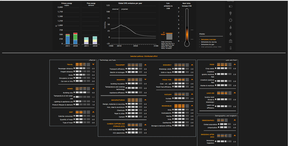 global-calcBuilt in collaboration with a number of international organisations from US, China, India and Europe, the calculator is an interactive tool for businesses, NGOs and governments to consider the options for cutting carbon emissions and the trade-offs for energy and land use to 2050.